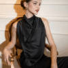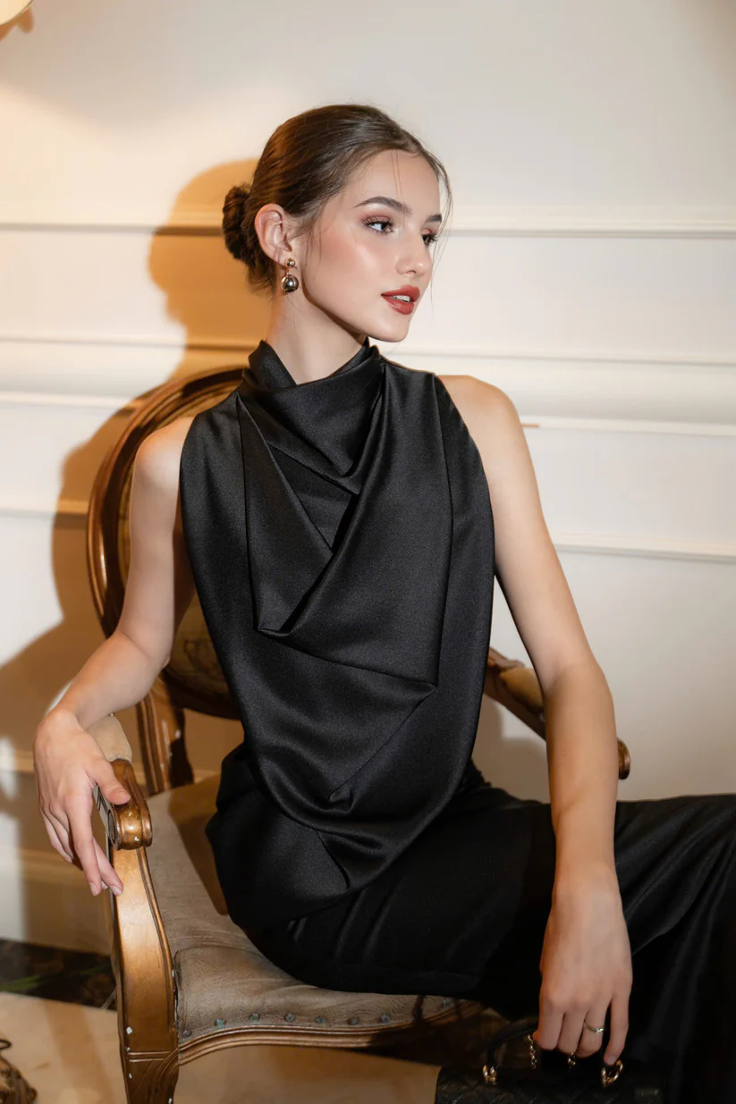 Black Satin Draped Evening Gown “Midnight Veil” DR303