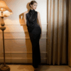 Black Satin Draped Evening Gown “Midnight Veil” DR303