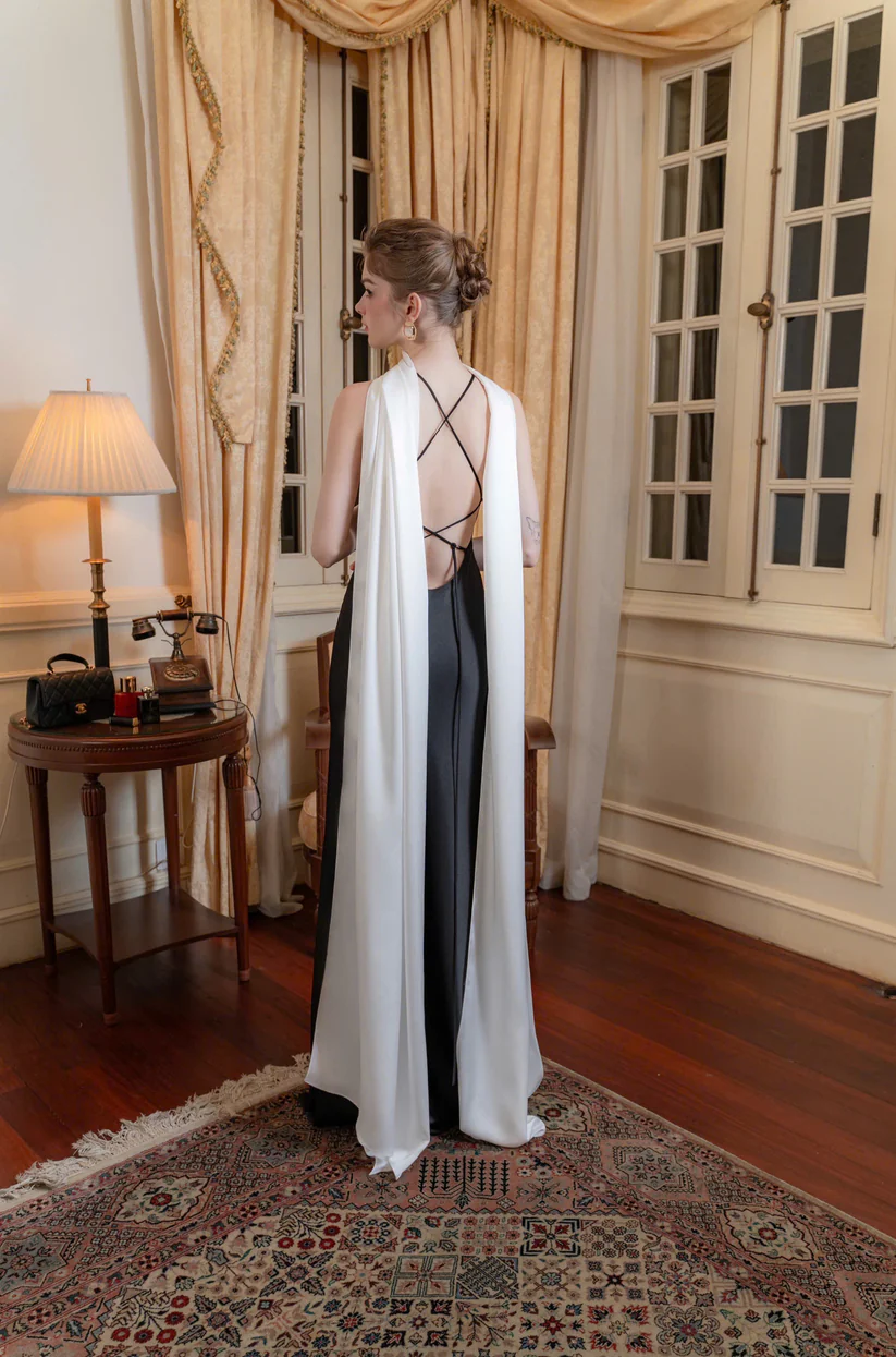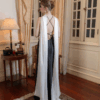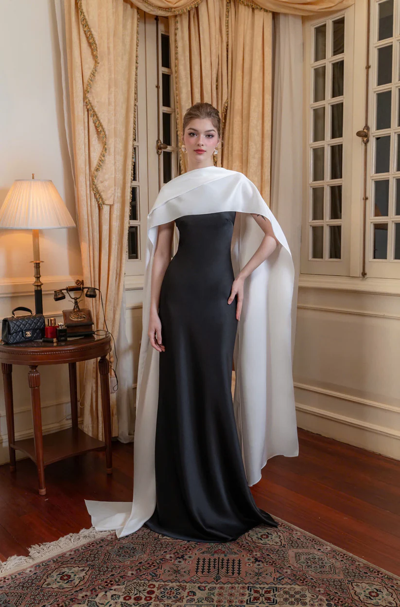 Black Satin Gown with Dramatic White Cape “Midnight Grace” DR623