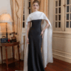 Black Satin Gown with Dramatic White Cape “Midnight Grace” DR623