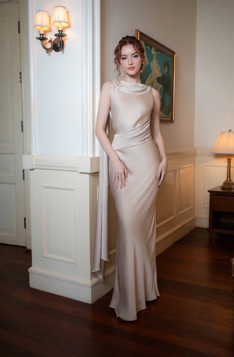 Champagne Satin Draped Gown “Celeste Whisper” DR184