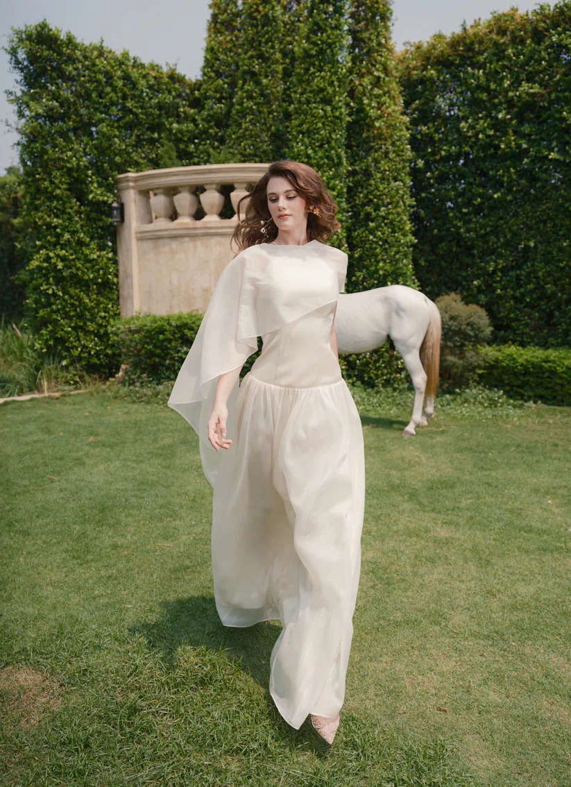 Ivory Organza Draped Evening Gown “Whisper Breeze” DR342