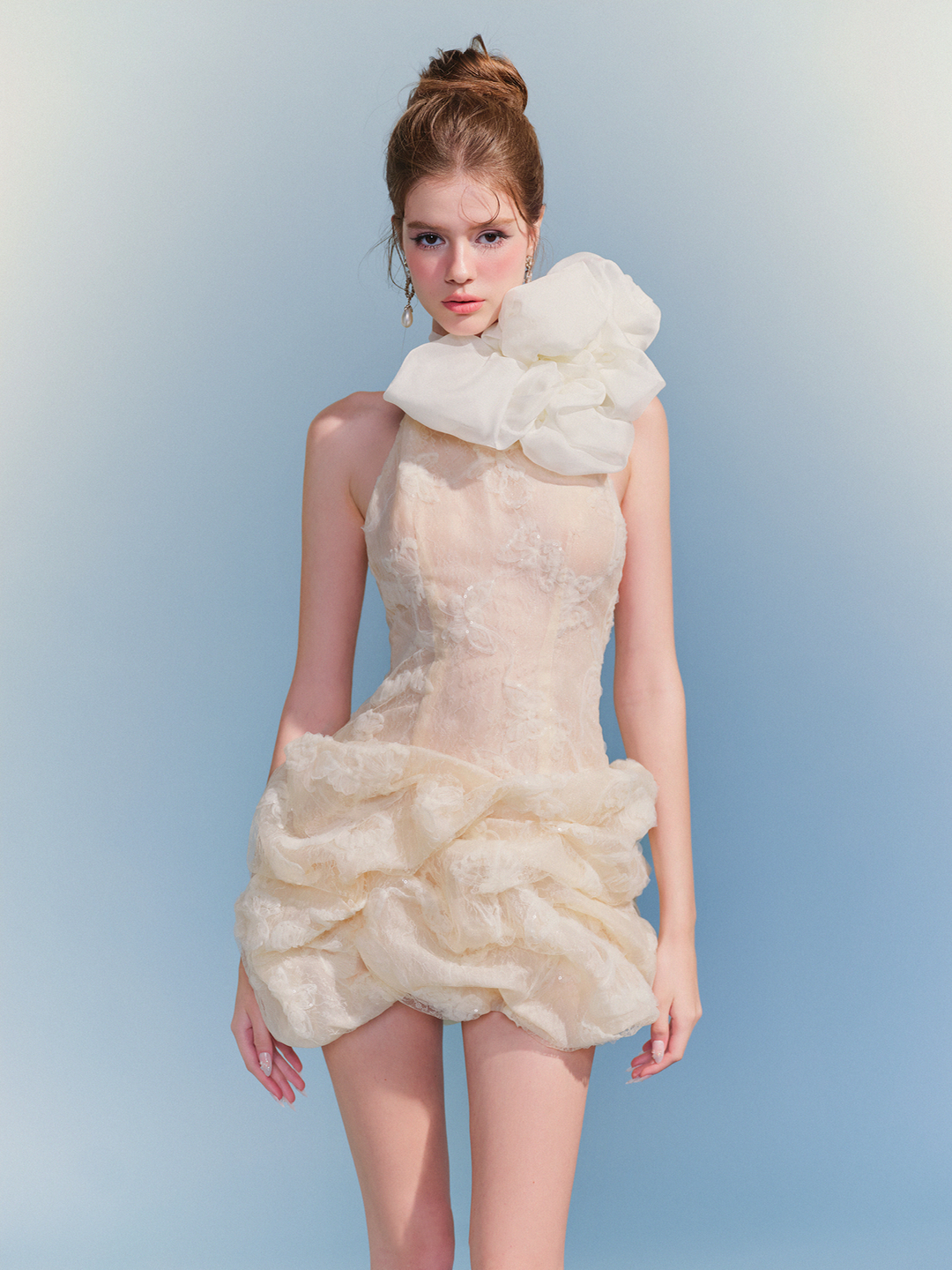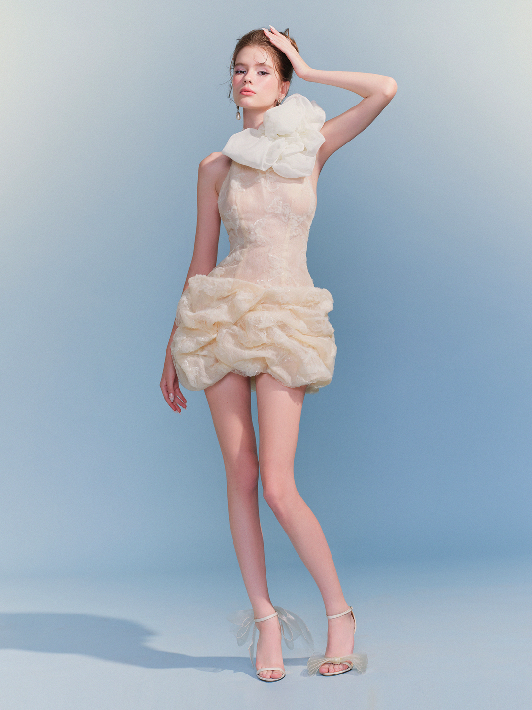 Ivory Organza Ruffle Mini Dress “Ethereal Bloom” EB310