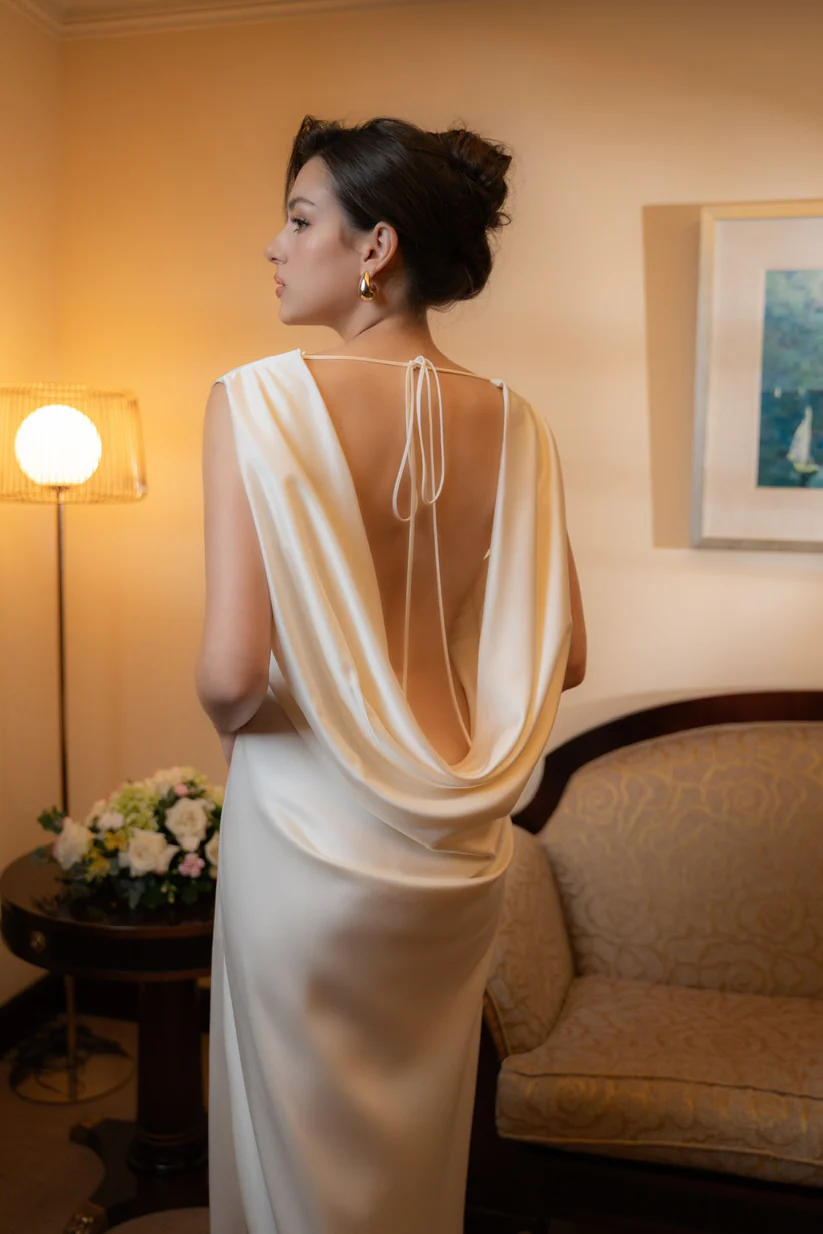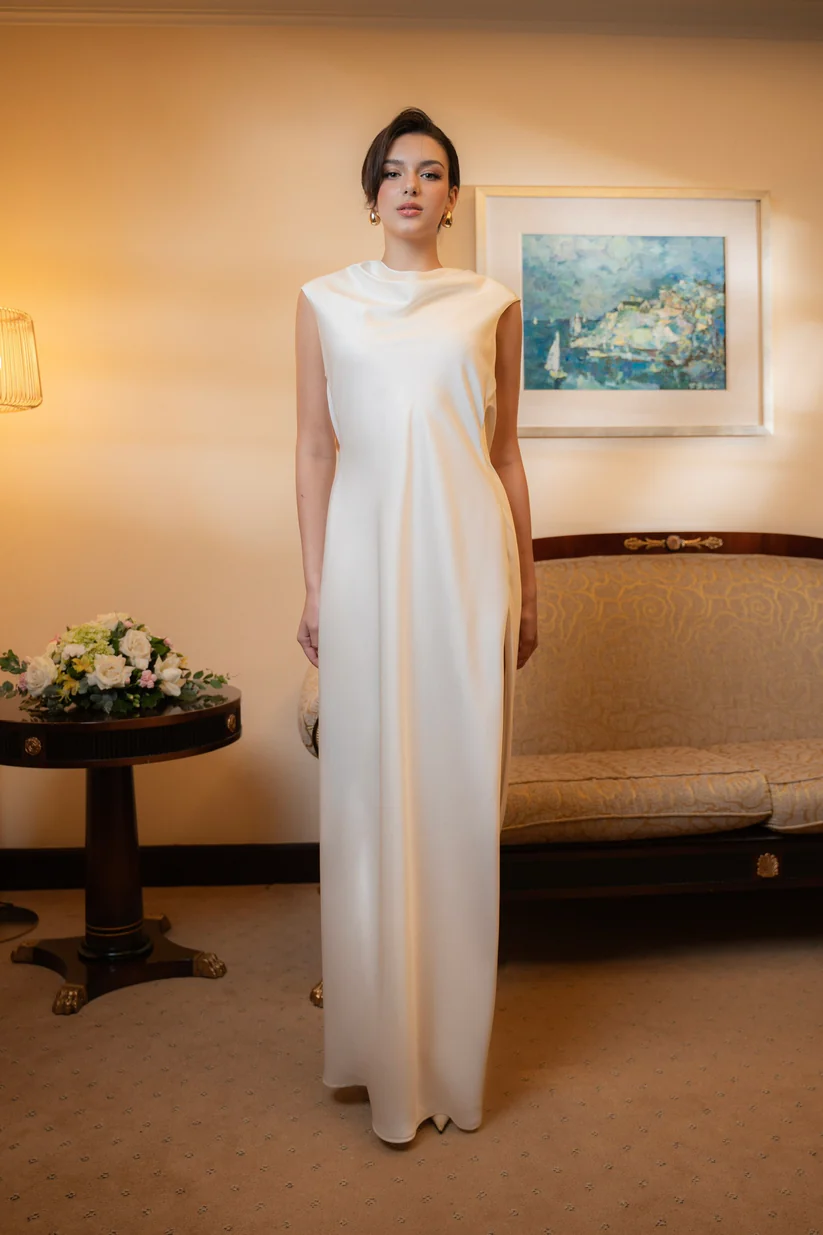 Ivory Satin Sleeveless Column Gown “Luna Glow” DR470