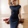 Navy Satin Cowl Neck Gown “Midnight Whisper” DR335