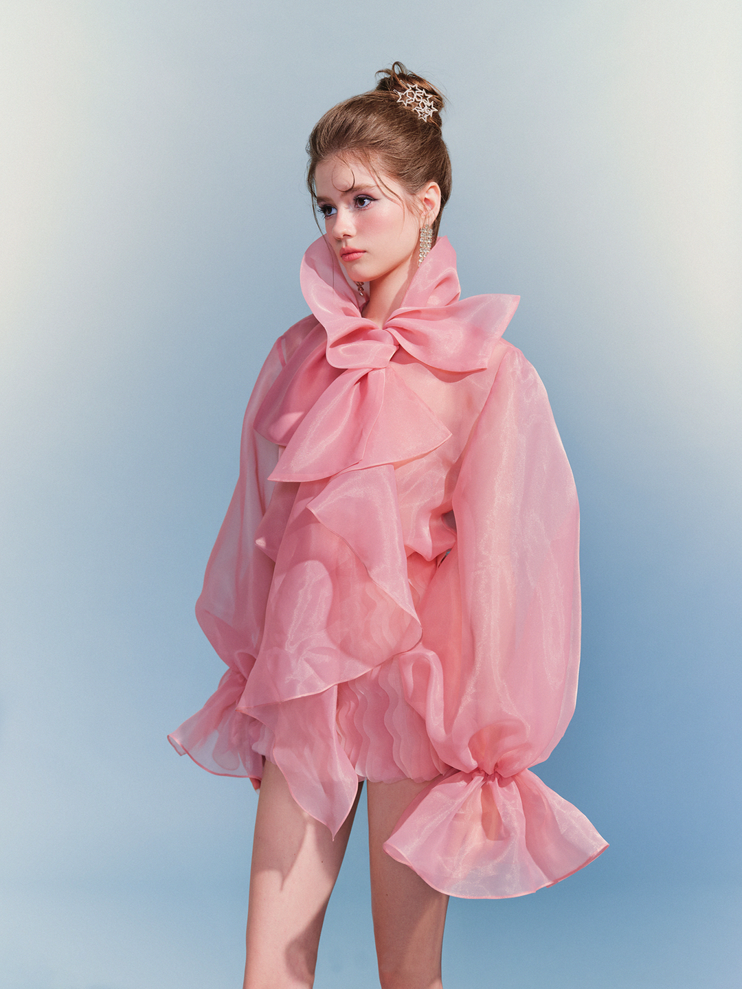 Pink Organza Bow & Ruffle Mini Dress Set “Petal Poise” PP102