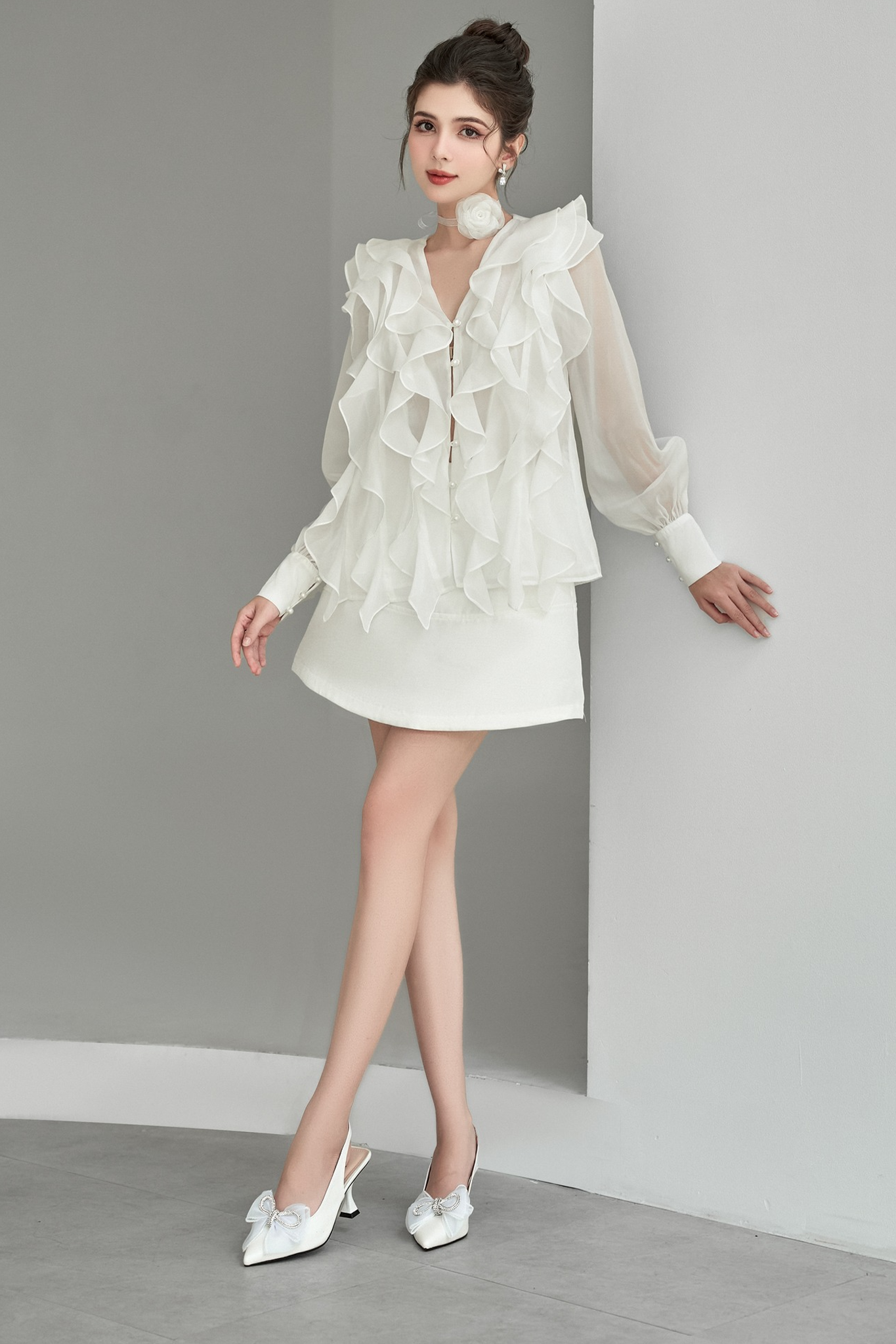 White Ruffled Chiffon Blouse & A-Line Skirt Set “Ivory Petal” IP318