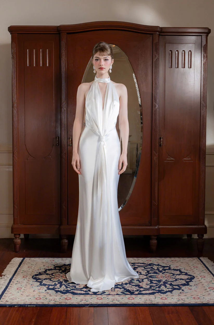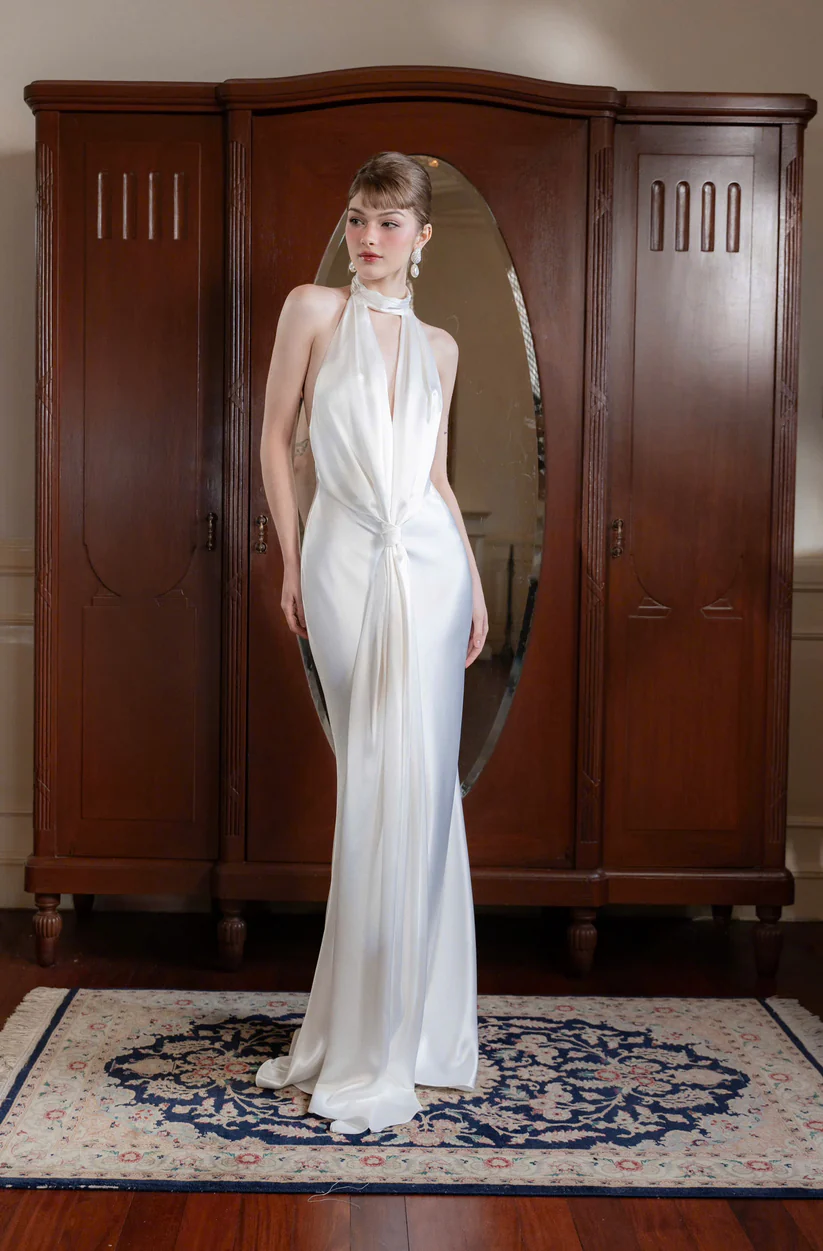 White Satin Halter Neck Gown “Luna Glow” DR491