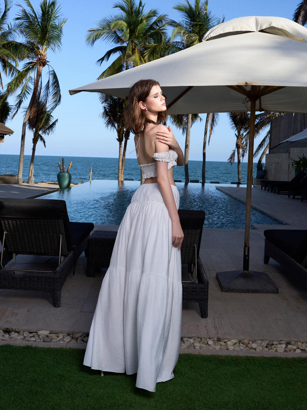 White Tiered Maxi Skirt and Off-Shoulder Crop Top Set “Ocean Breeze” DR928